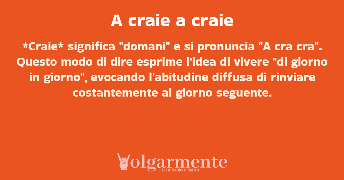 su0 down0 +0 *Craie* significa "domani" e si pronuncia "A cra cra". Questo modo di dire esprime l'idea di vivere "di giorno in giorno", evocando l'abitudine diffusa di rinviare costantemente al giorno seguente. da rudyyy Napoli, NA, Campania