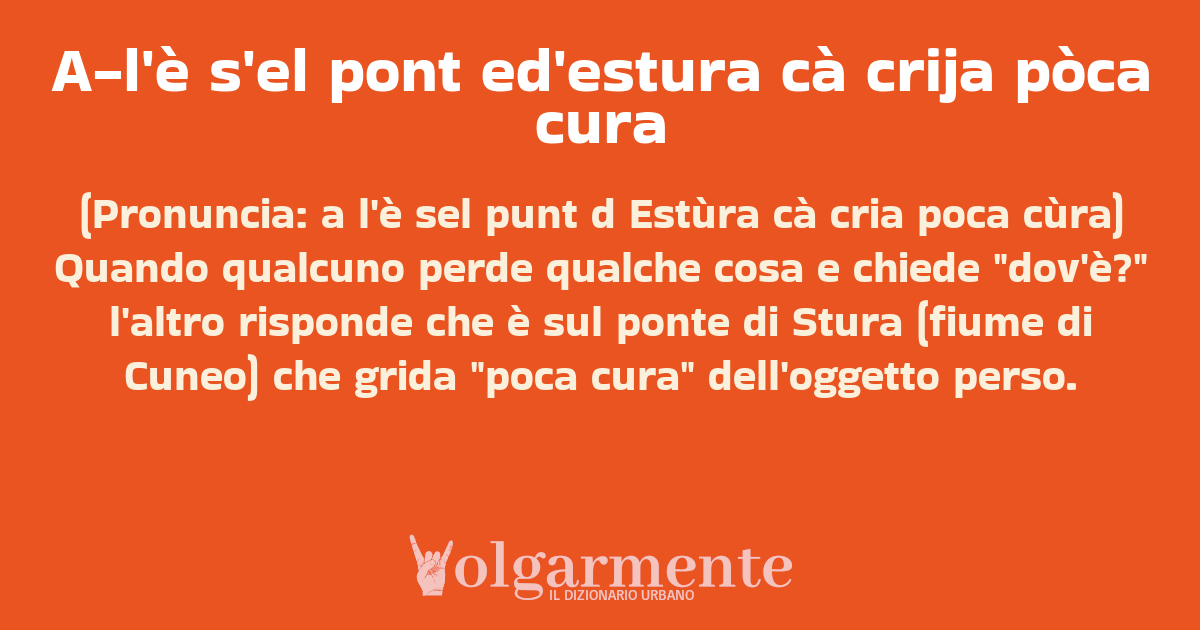 su0 down0 +0 (Pronuncia: a l'è sel punt d Estùra cà cria poca cùra) Quando qualcuno perde qualche cosa e chiede "dov'è?" l'altro risponde che è sul ponte di Stura (fiume di Cuneo) che grida "poca cura" dell'oggetto perso. da Anonimo Cuneo, CN, Piemonte