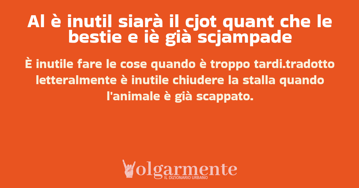 su0 down0 +0 È inutile fare le cose quando è troppo tardi.tradotto letteralmente è inutile chiudere la stalla quando l'animale è già scappato. da Anonimo Udine, UD, Friuli-Venezia Giulia