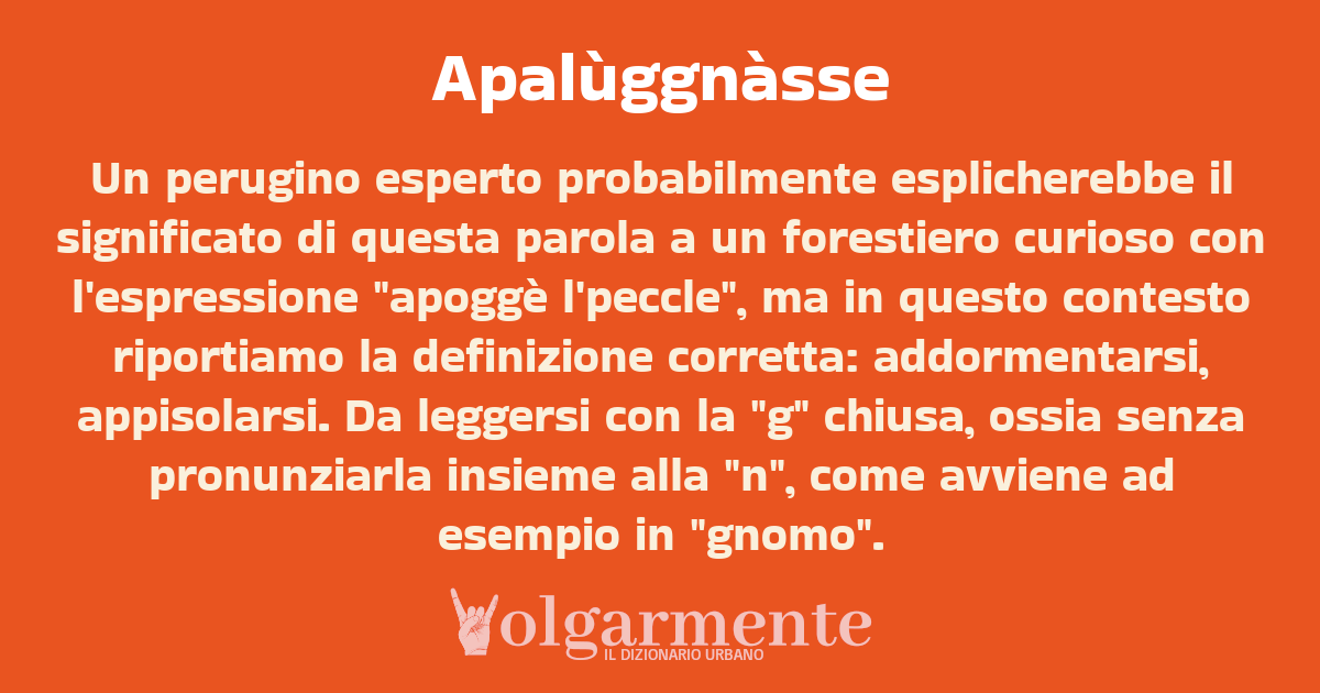 Un perugino esperto probabilmente esplicherebbe il significato di questa parola a un forestiero curioso con l'espressione "apoggè l'peccle", ma in questo contesto riportiamo la definizione corretta: addormentarsi, appisolarsi. Da leggersi con la "g" chiusa, ossia senza pronunziarla insieme alla "n", come avviene ad esempio in "gnomo".