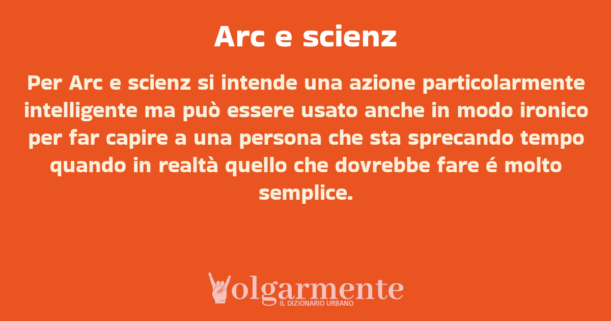 su0 down0 +0 Per Arc e scienz si intende una azione particolarmente intelligente ma può essere usato anche in modo ironico per far capire a una persona che sta sprecando tempo quando in realtà quello che dovrebbe fare é molto semplice. da Anonimo Napoli, NA, Campania