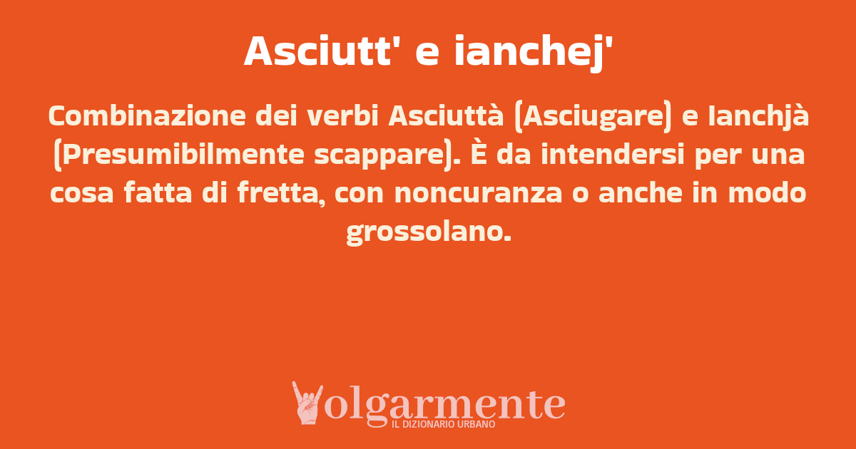 su0 down0 +0 Combinazione dei verbi Asciuttà (Asciugare) e Ianchjà (Presumibilmente scappare). È da intendersi per una cosa fatta di fretta, con noncuranza o anche in modo grossolano. da Anonimo Napoli, NA, Campania