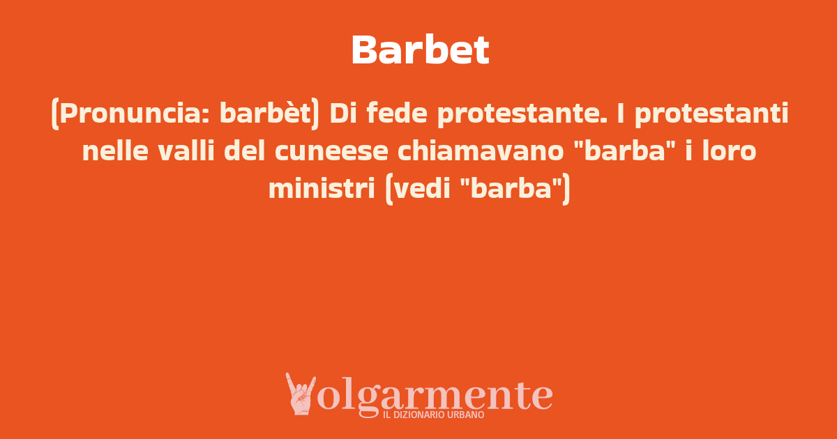 su0 down0 +0 (Pronuncia: barbèt) Di fede protestante. I protestanti nelle valli del cuneese chiamavano "barba" i loro ministri (vedi "barba") da Anonimo Cuneo, CN, Piemonte