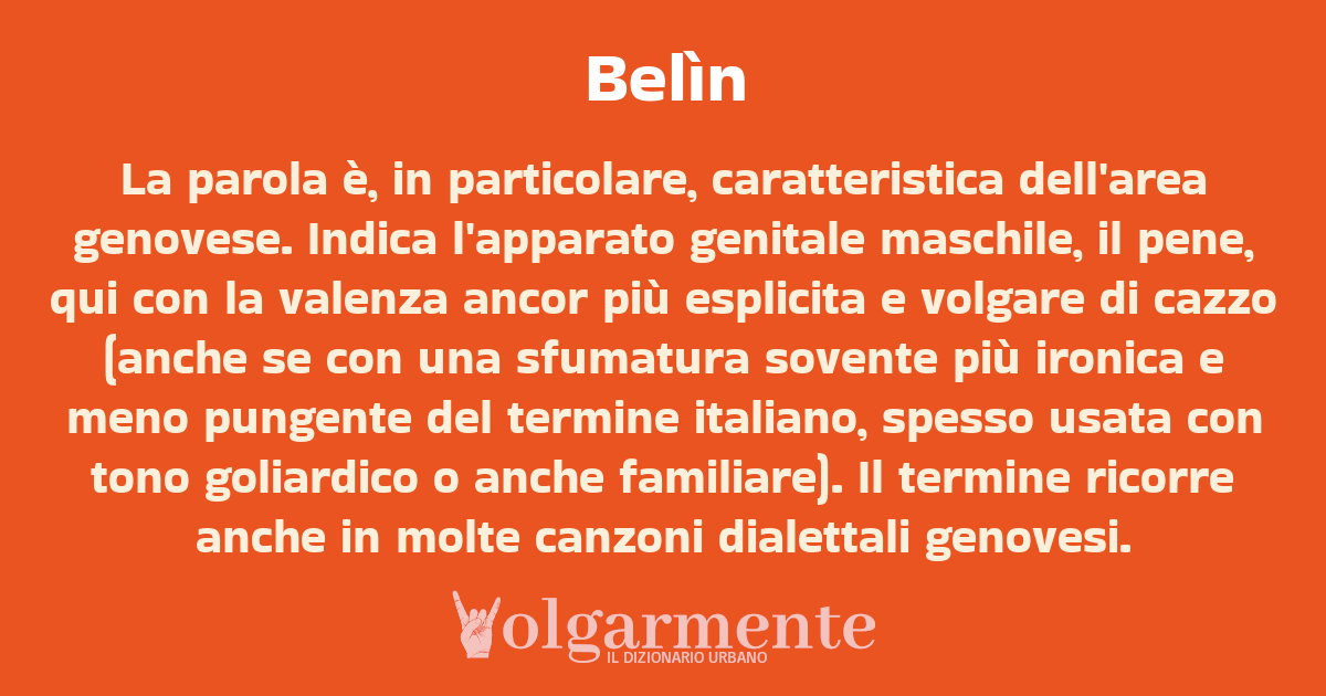 La parola è, in particolare, caratteristica dell'area genovese. Indica l'apparato genitale maschile, il pene, qui con la valenza ancor più esplicita e volgare di cazzo (anche se con una sfumatura sovente più ironica e meno pungente del termine italiano, spesso usata con tono goliardico o anche familiare). Il termine ricorre anche in molte canzoni dialettali genovesi.