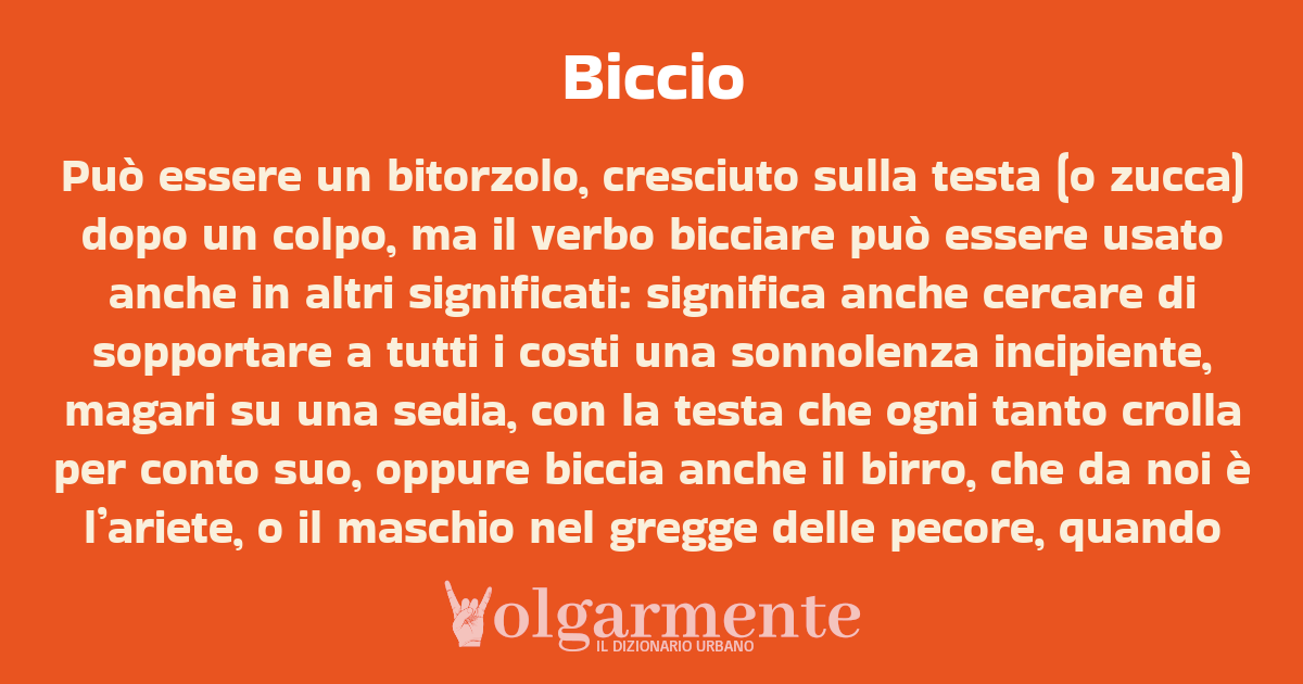 Può essere un bitorzolo, cresciuto sulla testa (o zucca) dopo un colpo, ma il verbo bicciare può essere usato anche in altri significati: significa anche cercare di sopportare a tutti i costi una sonnolenza incipiente, magari su una sedia, con la testa che ogni tanto crolla per conto suo, oppure biccia anche il birro, che da noi è l’ariete, o il maschio nel gregge delle pecore, quando prende a cornate i suoi rivali o qualsiasi altra cosa.