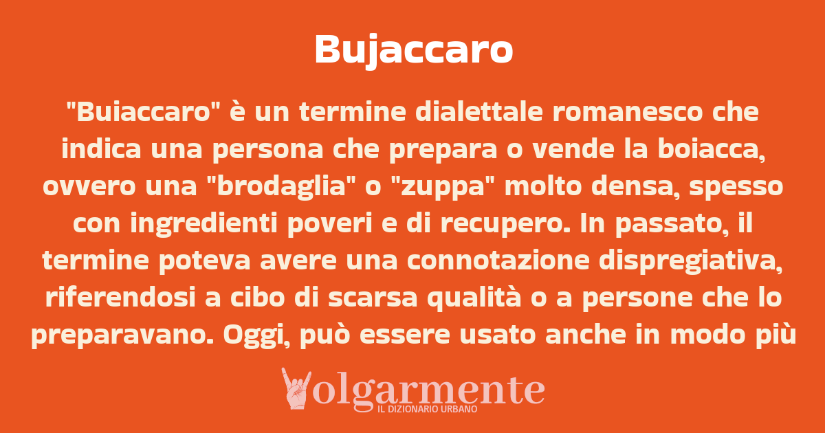 "Buiaccaro" è un termine dialettale romanesco che indica una persona che prepara o vende la boiacca, ovvero una "brodaglia" o "zuppa" molto densa, spesso con ingredienti poveri e di recupero. In passato, il termine poteva avere una connotazione dispregiativa, riferendosi a cibo di scarsa qualità o a persone che lo preparavano. Oggi, può essere usato anche in modo più affettuoso o scherzoso per indicare un cuoco che cucina piatti tradizionali e casalinghi, spesso legati alla cucina povera romana.