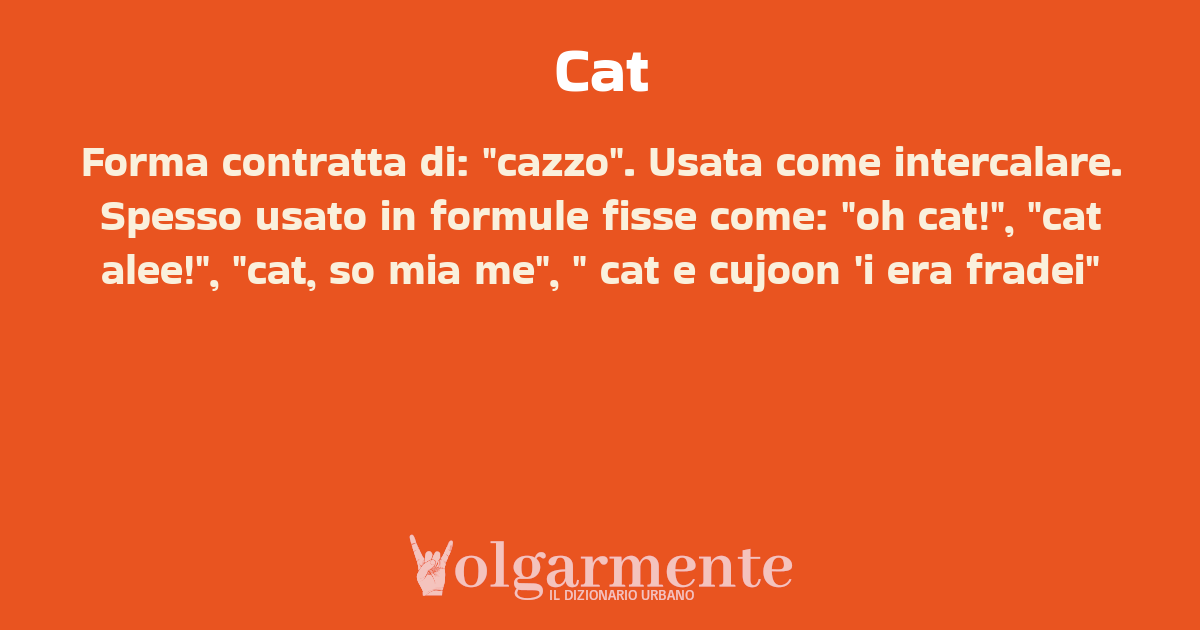 su0 down0 +0 Forma contratta di: "cazzo". Usata come intercalare. Spesso usato in formule fisse come: "oh cat!", "cat alee!", "cat, so mia me", " cat e cujoon 'i era fradei" da Anonimo Cremona, CR, Lombardia