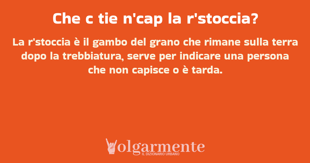 su0 down0 +0 La r'stoccia è il gambo del grano che rimane sulla terra dopo la trebbiatura, serve per indicare una persona che non capisce o è tarda. da Anonimo Arpino, FR, Lazio
