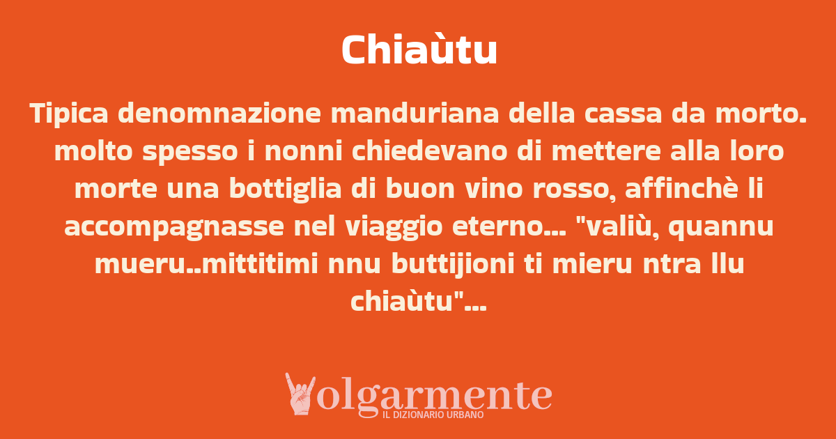 Tipica denomnazione manduriana della cassa da morto. molto spesso i nonni chiedevano di mettere alla loro morte una bottiglia di buon vino rosso, affinchè li accompagnasse nel viaggio eterno... "valiù, quannu mueru..mittitimi nnu buttijioni ti mieru ntra llu chiaùtu"...