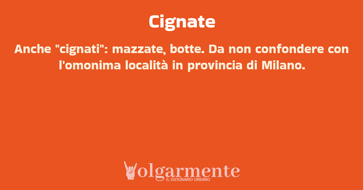 su0 down0 +0 Anche "cignati": mazzate, botte. Da non confondere con l'omonima località in provincia di Milano. da cursupino Francavilla Fontana, BR, Puglia