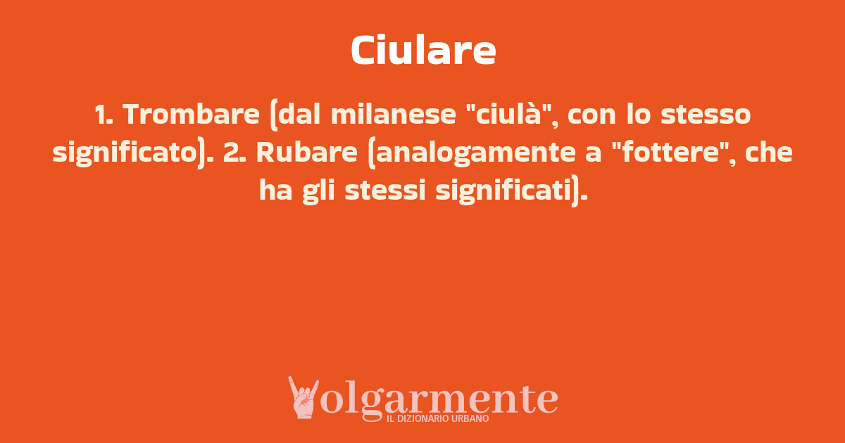 su0 down0 +0 1. Trombare (dal milanese "ciulà", con lo stesso significato). 2. Rubare (analogamente a "fottere", che ha gli stessi significati). da Anonimo Milano, MI, Lombardia