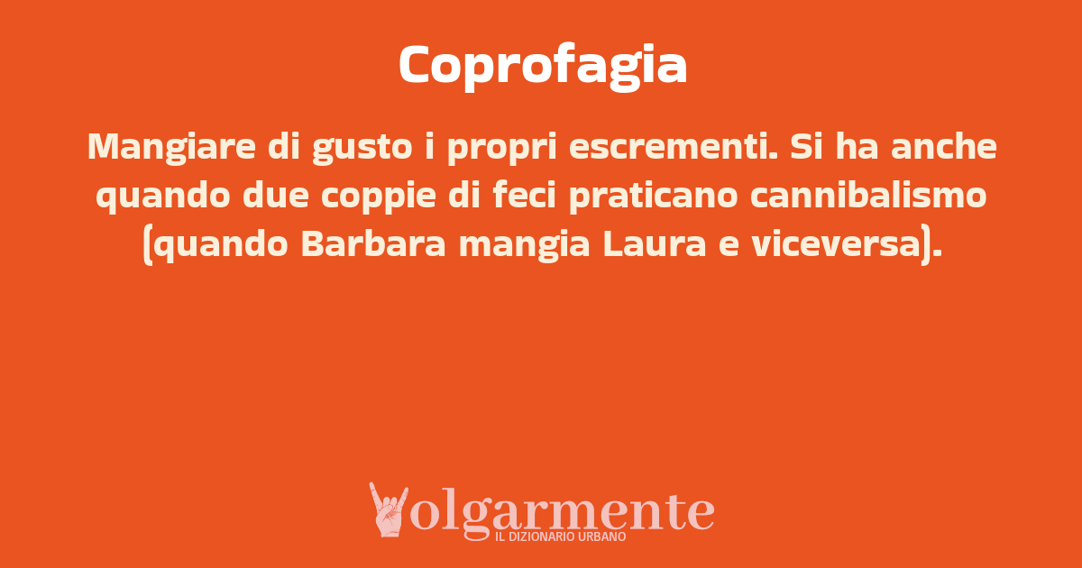 su0 down0 +0 Mangiare di gusto i propri escrementi. Si ha anche quando due coppie di feci praticano cannibalismo (quando Barbara mangia Laura e viceversa). da Anonimo Ferrara, FE, Emilia-Romagna