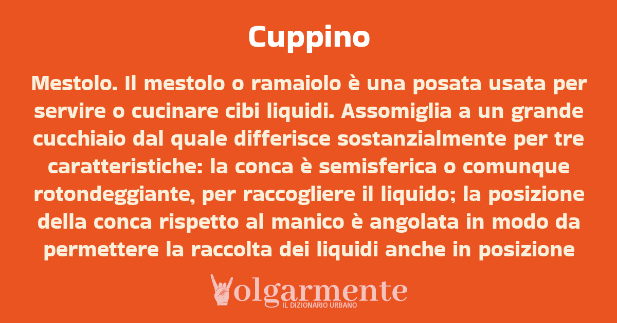 Mestolo. Il mestolo o ramaiolo è una posata usata per servire o cucinare cibi liquidi. Assomiglia a un grande cucchiaio dal quale differisce sostanzialmente per tre caratteristiche: la conca è semisferica o comunque rotondeggiante, per raccogliere il liquido; la posizione della conca rispetto al manico è angolata in modo da permettere la raccolta dei liquidi anche in posizione verticale, per esempio in contenitori stretti e alti come certe pentole; il manico è lungo, permette di mantenere una presa salda lontano da fonti di calore per non scottare la mano.