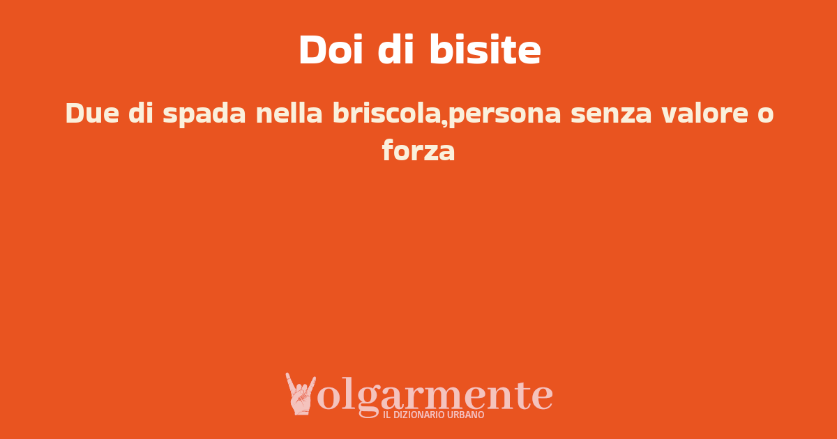 su0 down0 +0 Due di spada nella briscola,persona senza valore o forza Esempio: Tu sis come il doi di bisite da AdonPiter Udine, UD, Friuli-Venezia Giulia