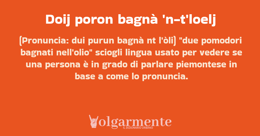 su0 down0 +0 (Pronuncia: dui purun bagnà nt l'òli) "due pomodori bagnati nell'olio" sciogli lingua usato per vedere se una persona è in grado di parlare piemontese in base a come lo pronuncia. da Anonimo Cuneo, CN, Piemonte