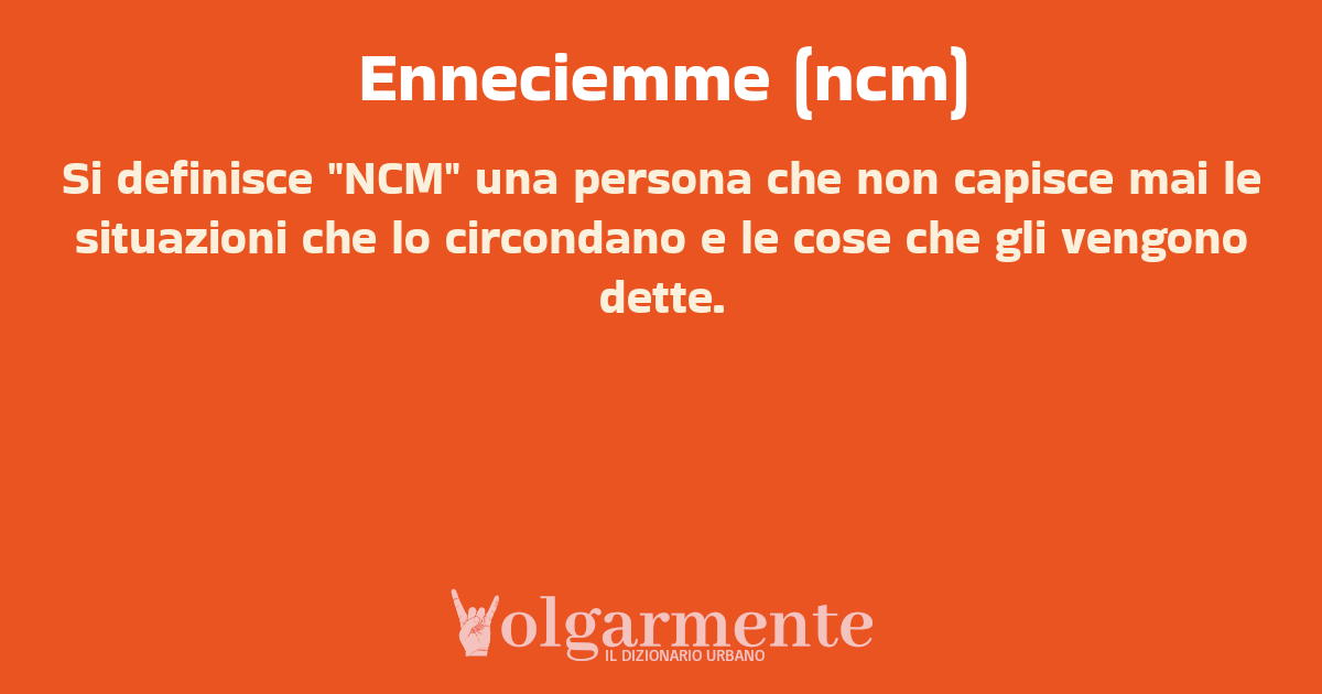 su0 down0 +0 Si definisce "NCM" una persona che non capisce mai le situazioni che lo circondano e le cose che gli vengono dette. da Anonimo Foggia, FG, Puglia