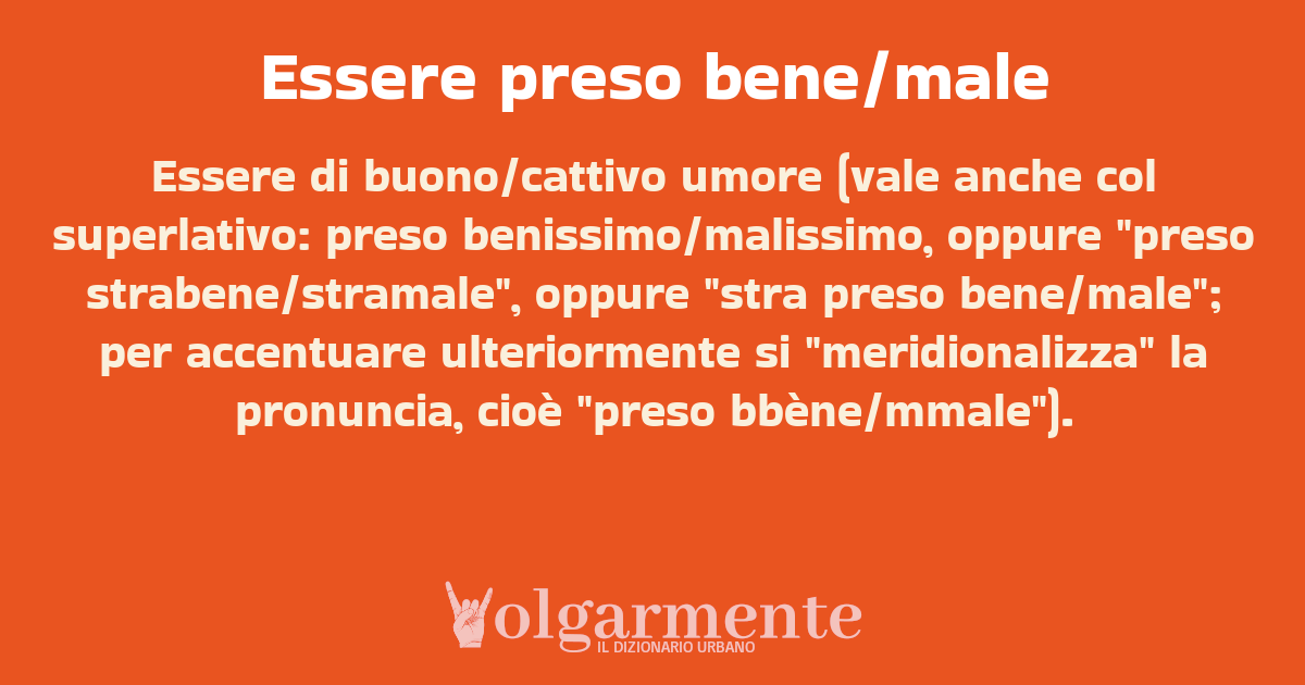 Essere di buono/cattivo umore (vale anche col superlativo: preso benissimo/malissimo, oppure "preso strabene/stramale", oppure "stra preso bene/male"; per accentuare ulteriormente si "meridionalizza" la pronuncia, cioè "preso bbène/mmale").