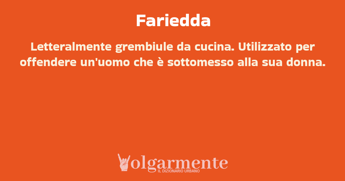 su0 down0 +0 Letteralmente grembiule da cucina. Utilizzato per offendere un'uomo che è sottomesso alla sua donna. da Anonimo Palermo, PA, Sicilia