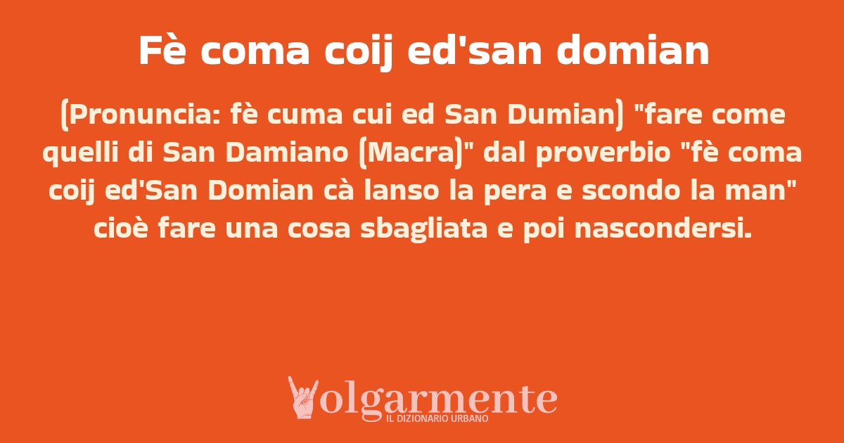 (Pronuncia: fè cuma cui ed San Dumian) "fare come quelli di San Damiano (Macra)" dal proverbio "fè coma coij ed'San Domian cà lanso la pera e scondo la man" cioè fare una cosa sbagliata e poi nascondersi.