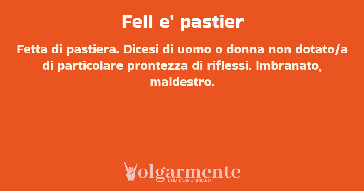 su0 down0 +0 Fetta di pastiera. Dicesi di uomo o donna non dotato/a di particolare prontezza di riflessi. Imbranato, maldestro. da Anonimo Giugliano in Campania, NA, Campania