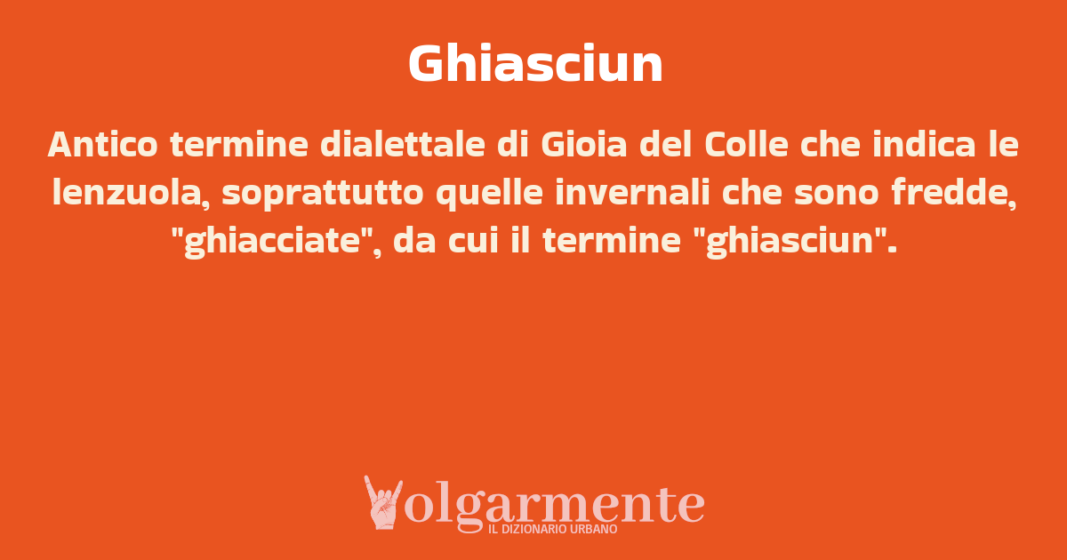 su0 down0 +0 Antico termine dialettale di Gioia del Colle che indica le lenzuola, soprattutto quelle invernali che sono fredde, "ghiacciate", da cui il termine "ghiasciun". da Anonimo Gioia del Colle, BA, Puglia