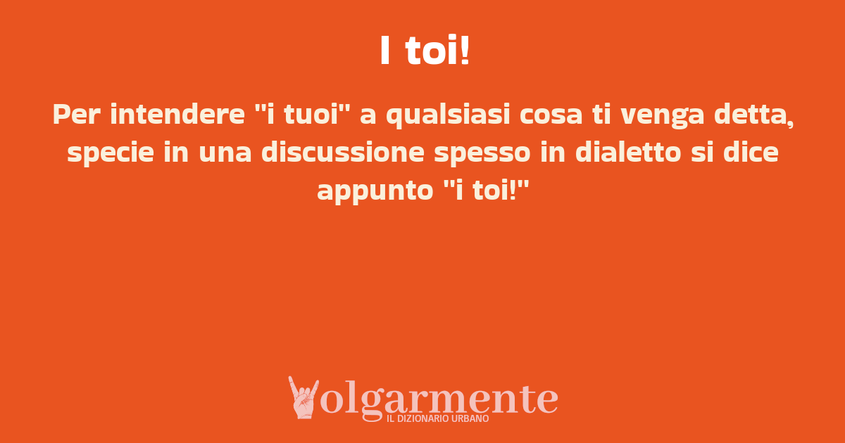 su0 down0 +0 Per intendere ''i tuoi'' a qualsiasi cosa ti venga detta, specie in una discussione spesso in dialetto si dice appunto ''i toi!'' da Anonimo Chioggia, VE, Veneto
