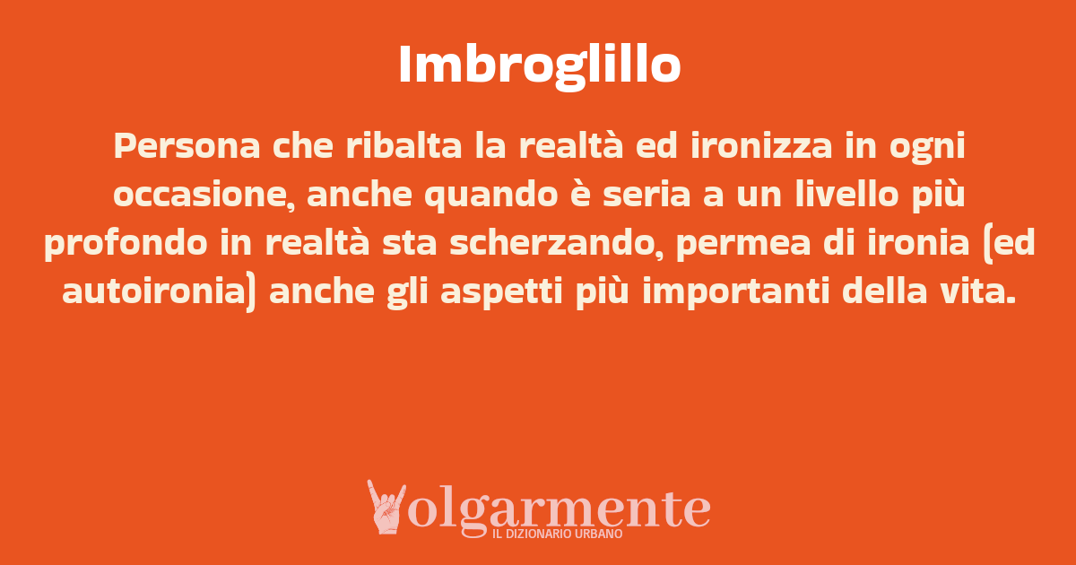 su0 down0 +0 Persona che ribalta la realtà ed ironizza in ogni occasione, anche quando è seria a un livello più profondo in realtà sta scherzando, permea di ironia (ed autoironia) anche gli aspetti più importanti della vita. da Anonimo Frascati, RM, Lazio