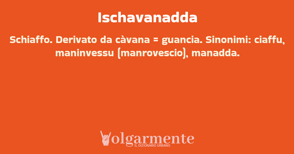 su0 down0 +0 Schiaffo. Derivato da càvana = guancia. Sinonimi: ciaffu, maninvessu (manrovescio), manadda. da Anonimo Sassari, SS, Sardegna