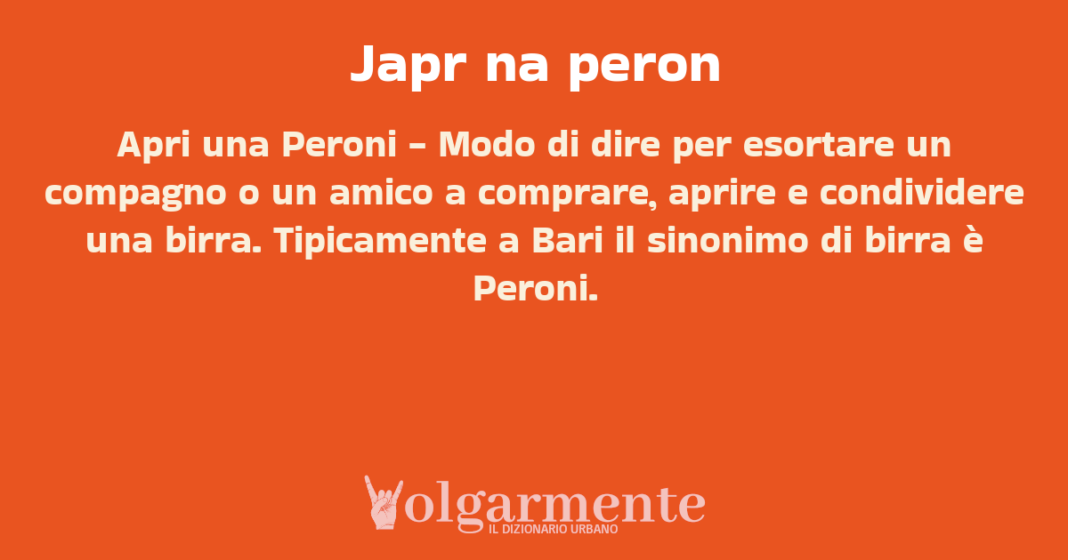 su0 down0 +0 Apri una Peroni - Modo di dire per esortare un compagno o un amico a comprare, aprire e condividere una birra. Tipicamente a Bari il sinonimo di birra è Peroni. da Anonimo Bari, BA, Puglia