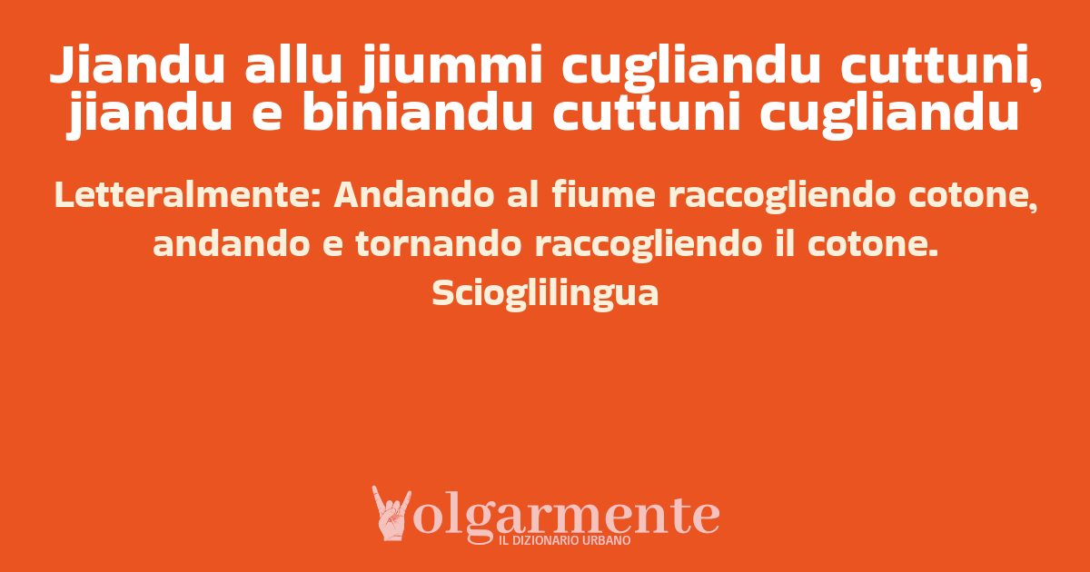 su0 down0 +0 Letteralmente: Andando al fiume raccogliendo cotone, andando e tornando raccogliendo il cotone. Scioglilingua da Anonimo Lamezia Terme, CZ, Calabria