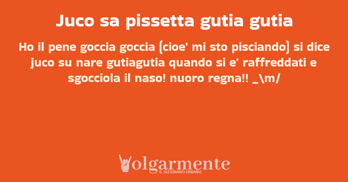 su0 down0 +0 Ho il pene goccia goccia (cioe' mi sto pisciando) si dice juco su nare gutiagutia quando si e' raffreddati e sgocciola il naso! nuoro regna!! _\m/ da Anonimo Nuoro, NU, Sardegna