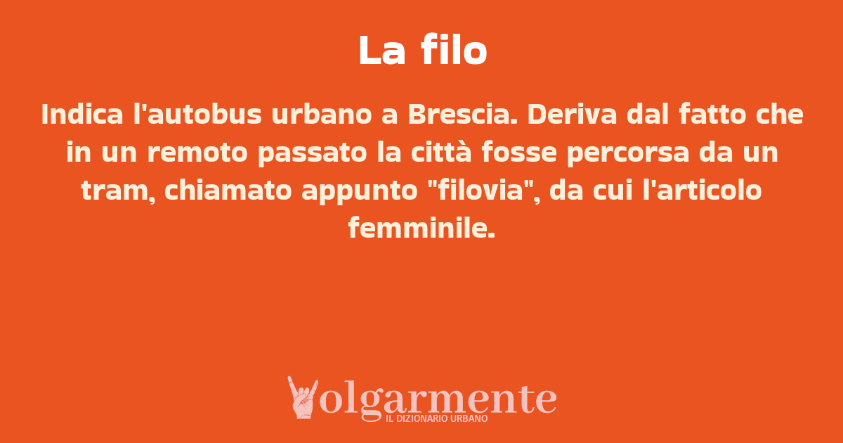 su0 down0 +0 Indica l'autobus urbano a Brescia. Deriva dal fatto che in un remoto passato la città fosse percorsa da un tram, chiamato appunto "filovia", da cui l'articolo femminile. da Frash Brescia, BS, Lombardia