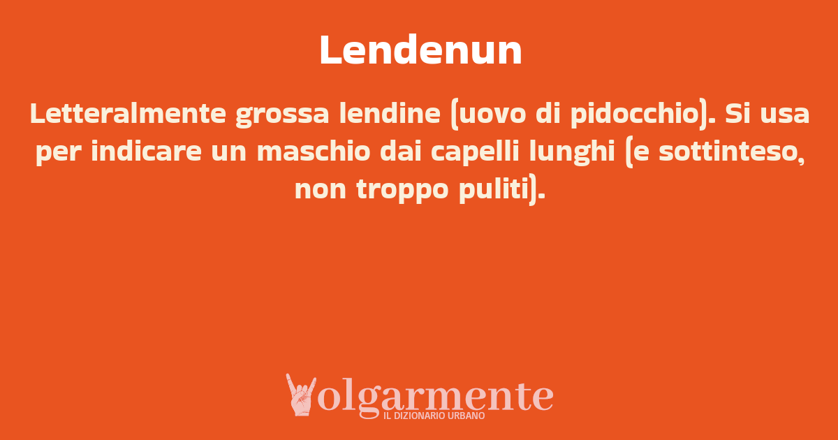 su0 down0 +0 Letteralmente grossa lendine (uovo di pidocchio). Si usa per indicare un maschio dai capelli lunghi (e sottinteso, non troppo puliti). da Anonimo Lecco, LC, Lombardia