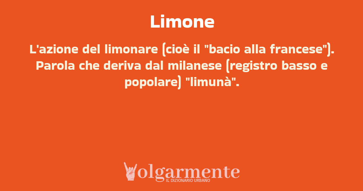 su0 down0 +0 L'azione del limonare (cioè il "bacio alla francese"). Parola che deriva dal milanese (registro basso e popolare) "limunà". da Anonimo Milano, MI, Lombardia
