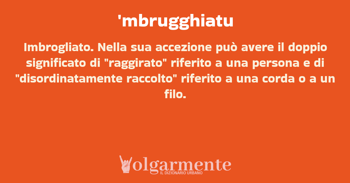 su0 down0 +0 Imbrogliato. Nella sua accezione può avere il doppio significato di "raggirato" riferito a una persona e di "disordinatamente raccolto" riferito a una corda o a un filo. da Anonimo San Giorgio Ionico, TA, Puglia