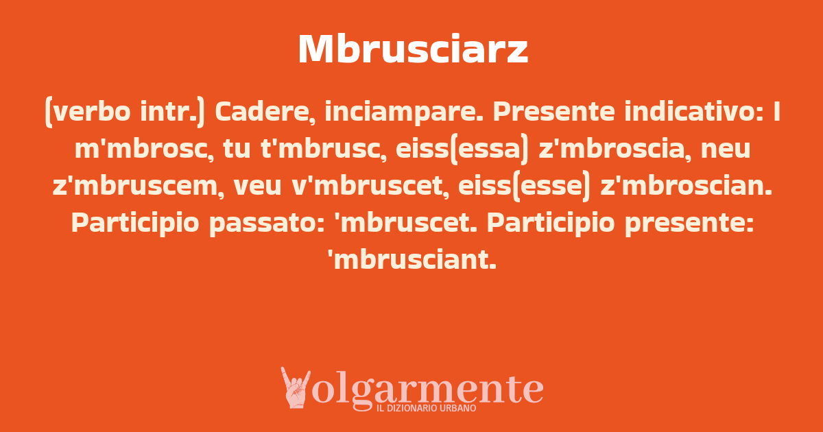 Presente indicativo: I m'mbrosc, tu t'mbrusc, eiss(essa) z'mbroscia, neu z'mbruscem, veu v'mbruscet, eiss(esse) z'mbroscian.