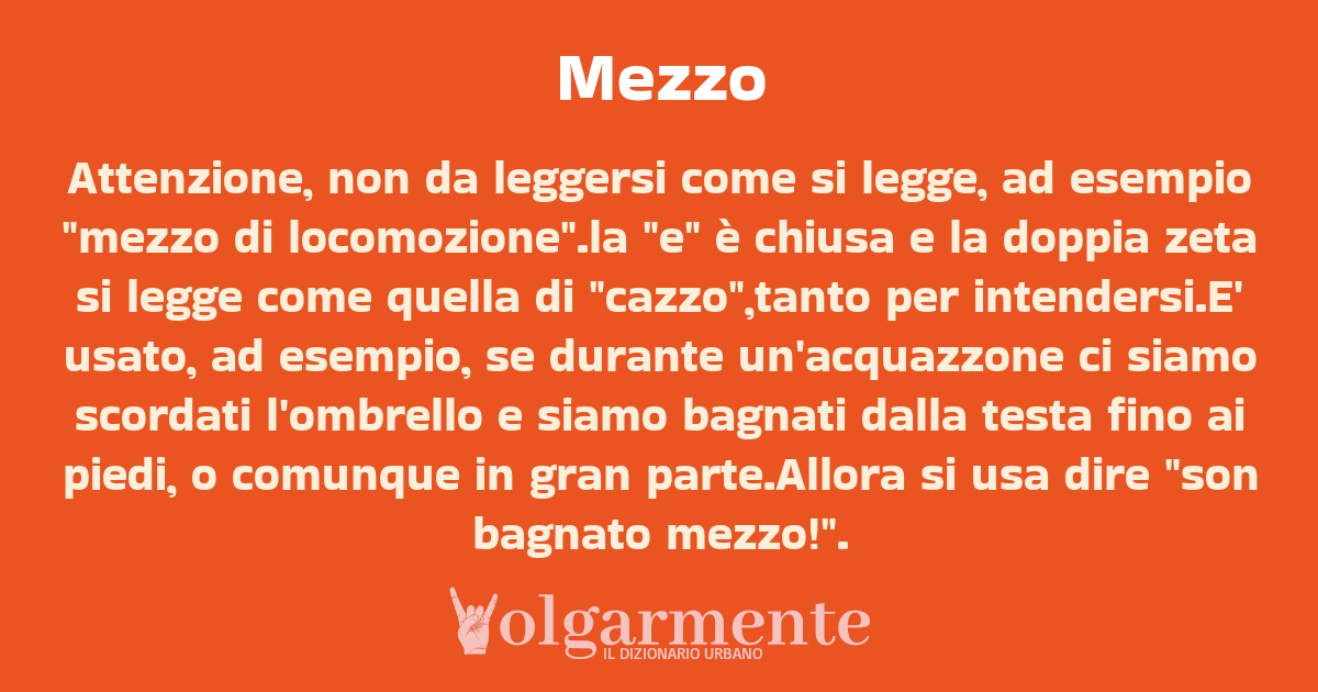 Attenzione, non da leggersi come si legge, ad esempio "mezzo di locomozione".la "e" è chiusa e la doppia zeta si legge come quella di "cazzo",tanto per intendersi.E' usato, ad esempio, se durante un'acquazzone ci siamo scordati l'ombrello e siamo bagnati dalla testa fino ai piedi, o comunque in gran parte.Allora si usa dire "son bagnato mezzo!".