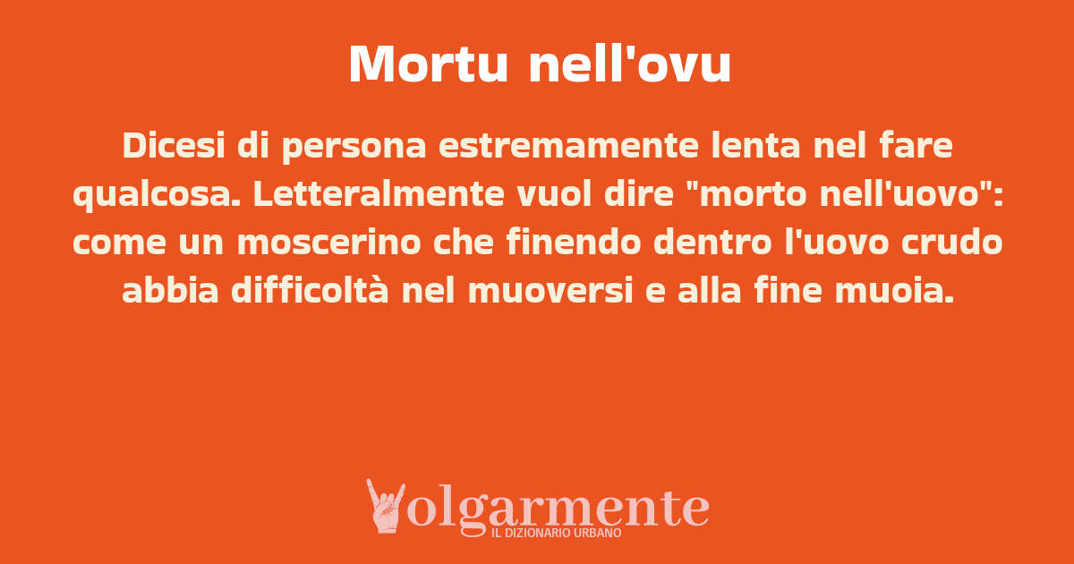 Dicesi di persona estremamente lenta nel fare qualcosa. Letteralmente vuol dire "morto nell'uovo": come un moscerino che finendo dentro l'uovo crudo abbia difficoltà nel muoversi e alla fine muoia.