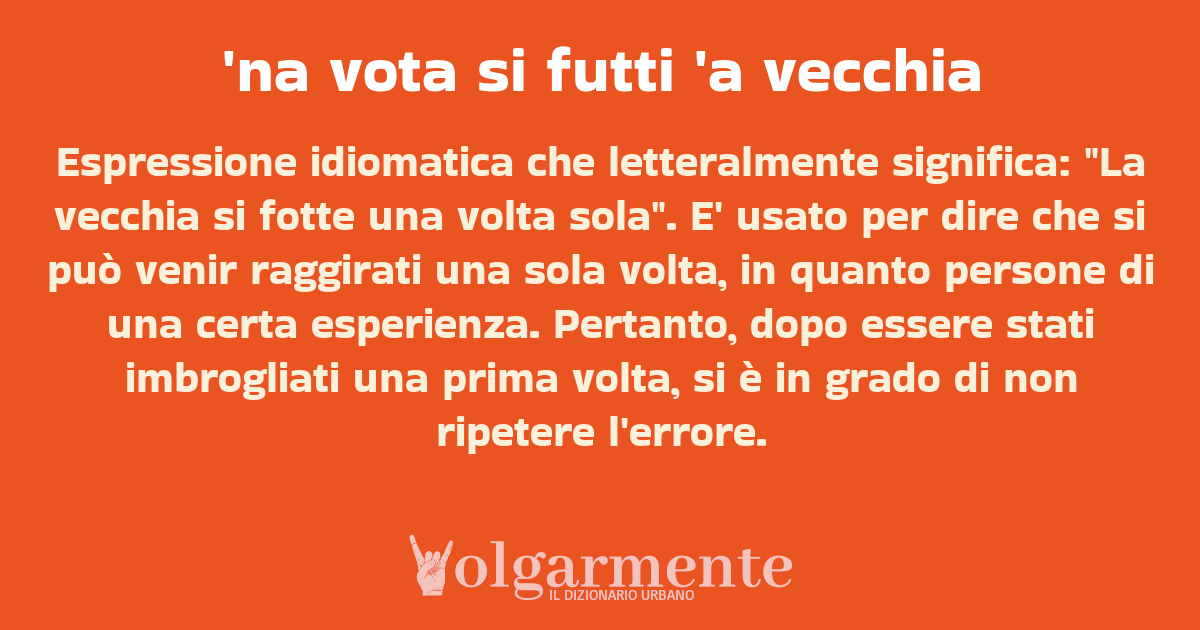 Espressione idiomatica che letteralmente significa: "La vecchia si fotte una volta sola". E' usato per dire che si può venir raggirati una sola volta, in quanto persone di una certa esperienza. Pertanto, dopo essere stati imbrogliati una prima volta, si è in grado di non ripetere l'errore.