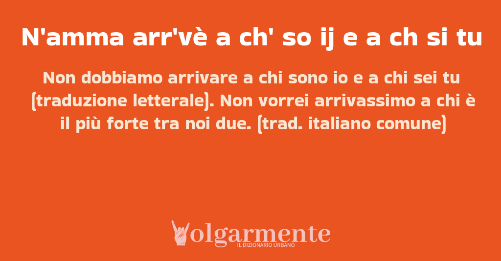 su0 down0 +0 Non dobbiamo arrivare a chi sono io e a chi sei tu (traduzione letterale). Non vorrei arrivassimo a chi è il più forte tra noi due. (trad. italiano comune) da Anonimo Monte Sant'Angelo, FG, Puglia