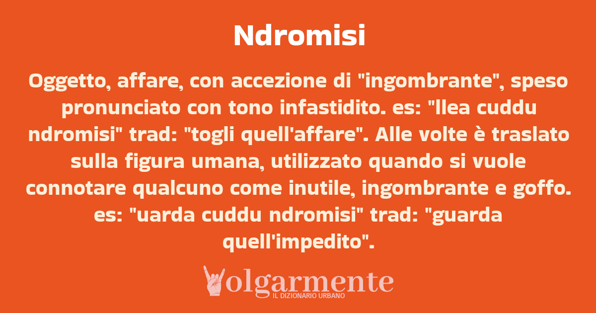 Oggetto, affare, con accezione di "ingombrante", speso pronunciato con tono infastidito. es: "llea cuddu ndromisi" trad: "togli quell'affare". Alle volte è traslato sulla figura umana, utilizzato quando si vuole connotare qualcuno come inutile, ingombrante e goffo. es: "uarda cuddu ndromisi" trad: "guarda quell'impedito".