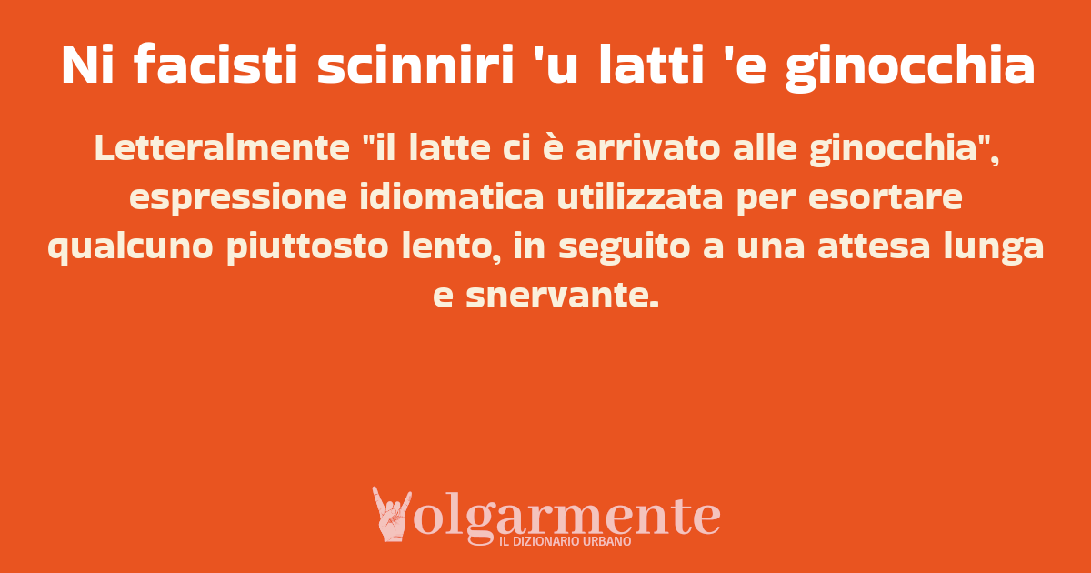 su0 down0 +0 Letteralmente "il latte ci è arrivato alle ginocchia", espressione idiomatica utilizzata per esortare qualcuno piuttosto lento, in seguito a una attesa lunga e snervante. da Anonimo Messina, ME, Sicilia