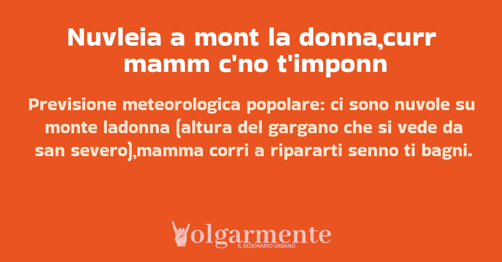 su0 down0 +0 Previsione meteorologica popolare: ci sono nuvole su monte ladonna (altura del gargano che si vede da san severo),mamma corri a ripararti senno ti bagni. da Anonimo San Severo, FG, Puglia