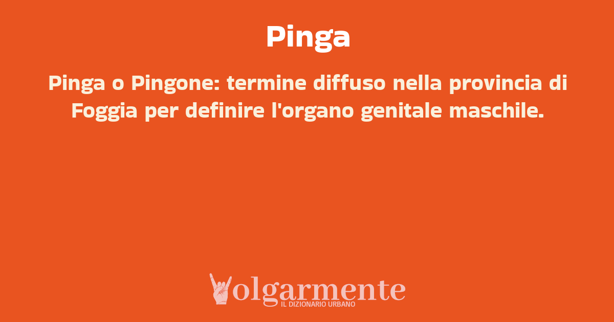 su0 down0 +0 Pinga o Pingone: termine diffuso nella provincia di Foggia per definire l'organo genitale maschile. da Anonimo Foggia, FG, Puglia