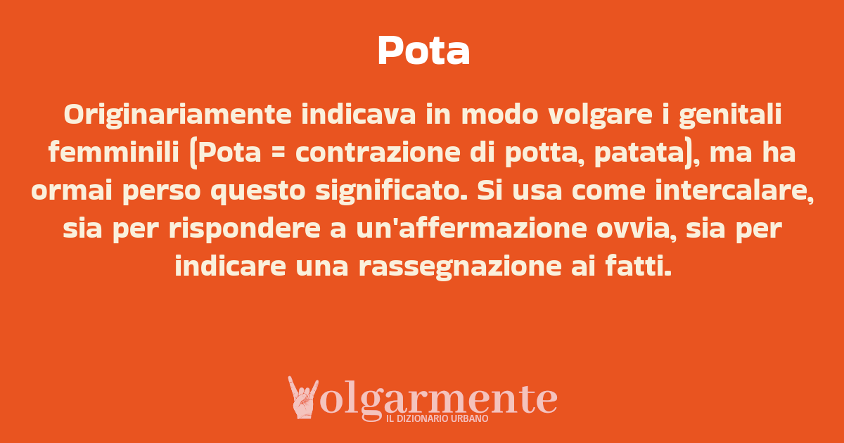 Originariamente indicava in modo volgare i genitali femminili (Pota = contrazione di potta, patata), ma ha ormai perso questo significato.