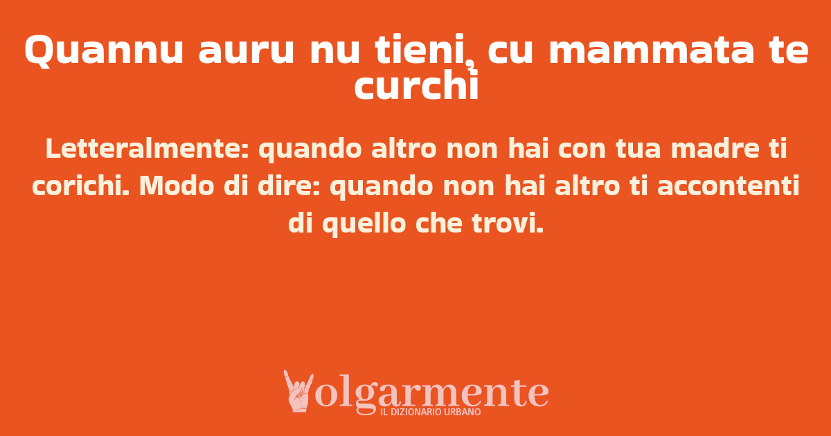 su0 down0 +0 Letteralmente: quando altro non hai con tua madre ti corichi. Modo di dire: quando non hai altro ti accontenti di quello che trovi. da Anonimo Vernole, LE, Puglia