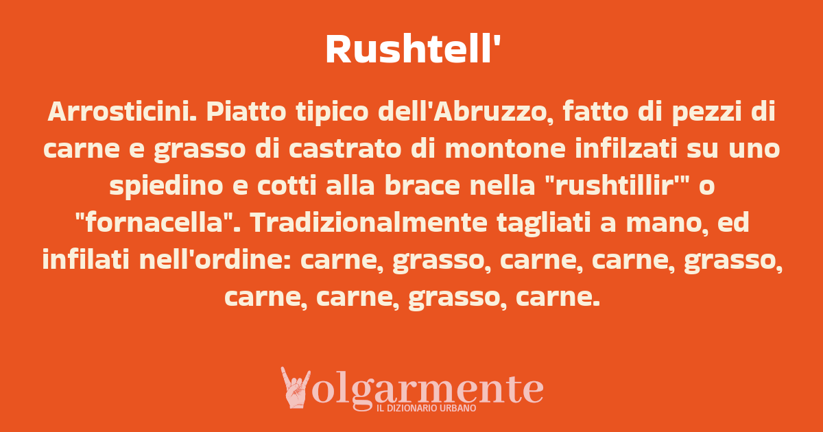Arrosticini. Piatto tipico dell'Abruzzo, fatto di pezzi di carne e grasso di castrato di montone infilzati su uno spiedino e cotti alla brace nella "rushtillir'" o "fornacella". Tradizionalmente tagliati a mano, ed infilati nell'ordine: carne, grasso, carne, carne, grasso, carne, carne, grasso, carne.