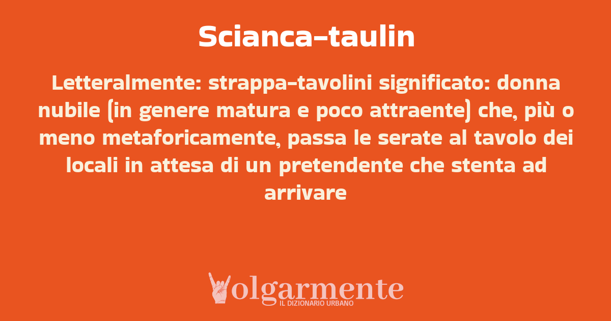 su0 down0 +0 Letteralmente: strappa-tavolini significato: donna nubile (in genere matura e poco attraente) che, più o meno metaforicamente, passa le serate al tavolo dei locali in attesa di un pretendente che stenta ad arrivare da maghirko Casale Monferrato, AL, Piemonte