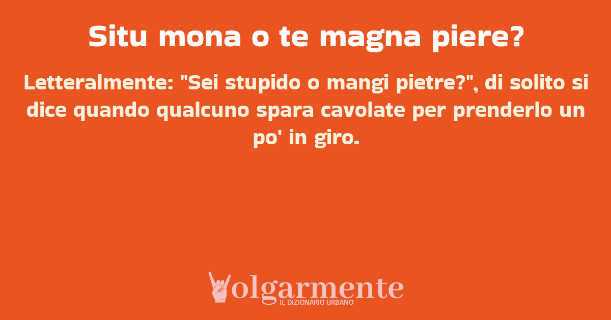 su0 down0 +0 Letteralmente: "Sei stupido o mangi pietre?", di solito si dice quando qualcuno spara cavolate per prenderlo un po' in giro. da skiabo97 San Donà di Piave, VE, Veneto