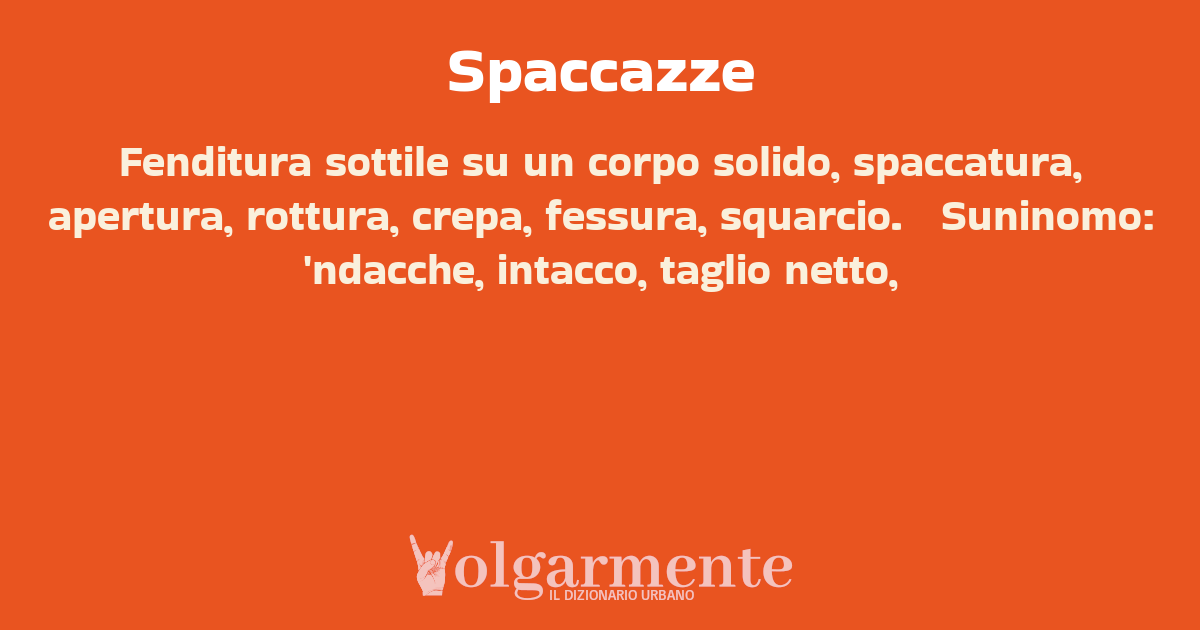 su0 down0 +0 Fenditura sottile su un corpo solido, spaccatura, apertura, rottura, crepa, fessura, squarcio. Suninomo: 'ndacche, intacco, taglio netto, da Anonimo Manfredonia, FG, Puglia